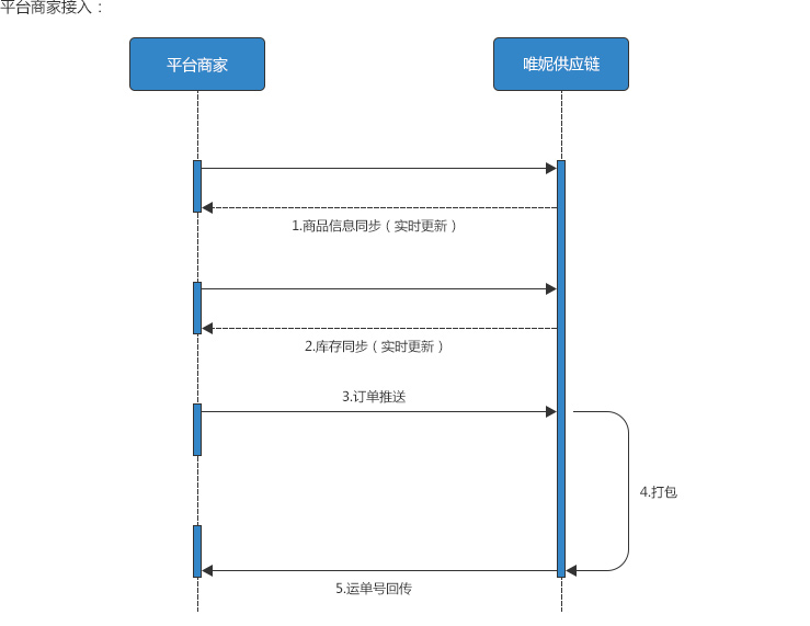 1.平台商家的对接主要是为了支持唯妮供应链的平台商家能够快捷有效的开展商品管理及订单处理业务,具体流程如下: