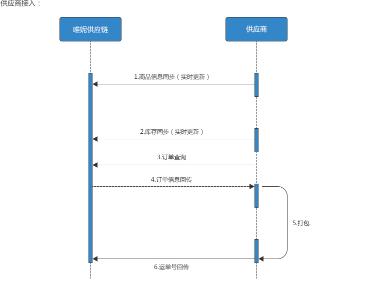 2.供应商的对接主要是为了支持唯妮供应链的国内外供应商能够快捷有效的开展商品管理及一件代发业务,具体流程如下: